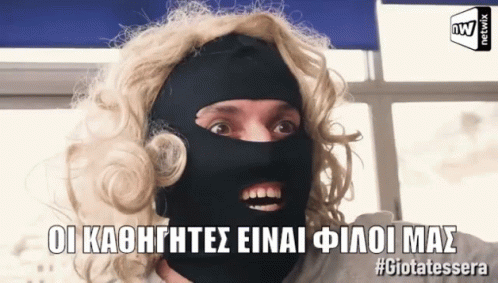 Alexandros Tsouvelas in a Netwix sketch, wearing a blonde wig and balaclava, with the caption 'The teachers are our friends'.