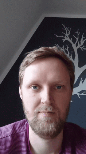 Neupi Hm, a man with a beard and blue eyes, smiles at the camera while wearing a purple striped shirt.