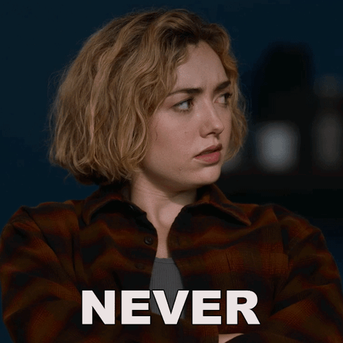 Peyton List as Madison Nears in a plaid shirt, with the word 'NEVER' displayed prominently.