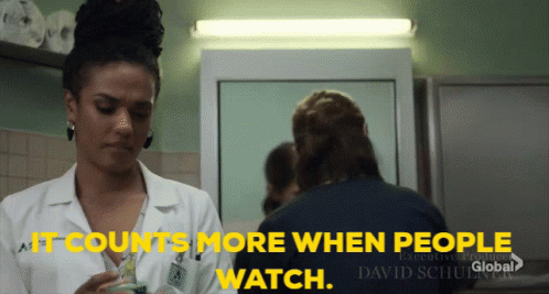Dr. Lauren Bloom (Janet Montgomery) from New Amsterdam in a medical setting, stating 'It counts more when people watch.'