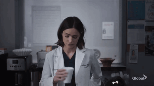 Lauren Bloom, played by Janet Montgomery, takes a coffee break in her lab coat on New Amsterdam.
