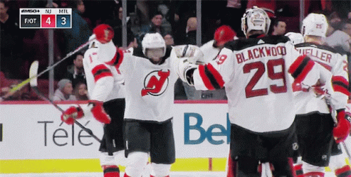 New Jersey Devils players, including Mackenzie Blackwood and Wayne Simmonds, celebrate an overtime win against the Montreal Canadiens.