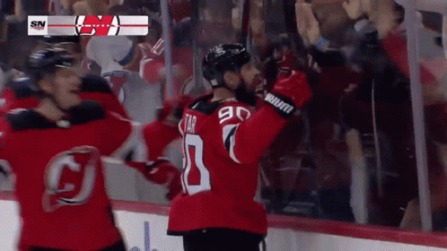 New Jersey Devils' Tomas Tatar celebrates a goal with teammates Hischier and Thaler during an NHL game.