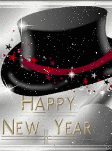 A festive New Year greeting card featuring a black top hat, red ribbon, and sparkling stars.