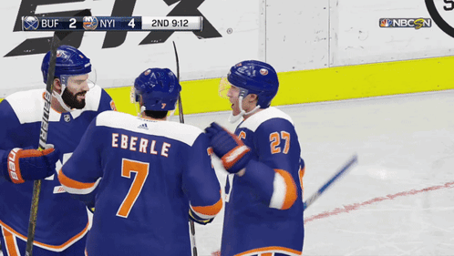 New York Islanders player Anders Lee celebrates a goal with teammates during an NHL game.