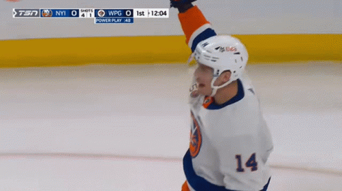 Bo Horvat of the New York Islanders celebrates a goal with a teammate during an NHL game.