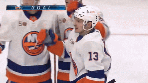 Mat Barzal celebrates a goal with his New York Islanders teammates in an exciting NHL game.