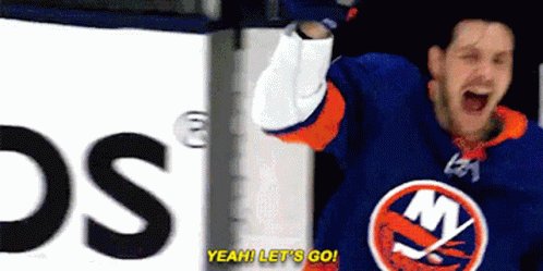 New York Islanders player Mat Barzal enthusiastically shouts 'Yeah! Let's Go!' on the ice.