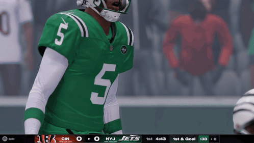 New York Jets player Garrett Wilson, number 5, on the field during an NFL game, celebrating a play.