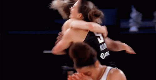 New York Liberty basketball players share a celebratory hug on the court during a WNBA game.