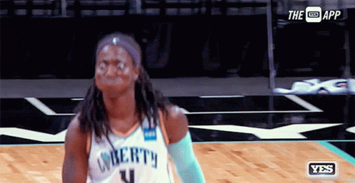 Jazmine Jones of the New York Liberty basketball team makes a funny face and bites her lip.