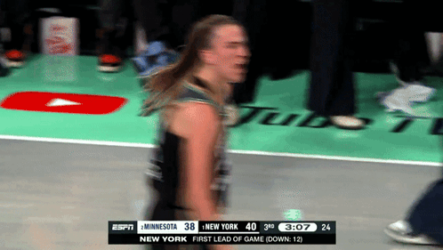 Sabrina Ionescu of the New York Liberty celebrates intensely after her team takes the lead against Minnesota in a WNBA game.
