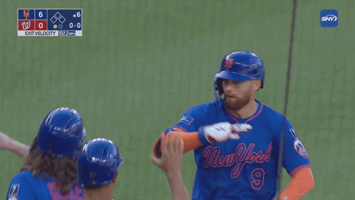 Brandon Nimmo of the New York Mets high-fives a teammate after a play, celebrating on the field.