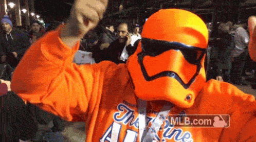 A New York Mets fan dressed as an orange Stormtrooper enthusiastically cheers at a baseball game.