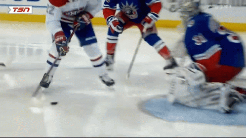 New York Rangers goalie Igor Shesterkin makes a crucial save during an intense hockey game.