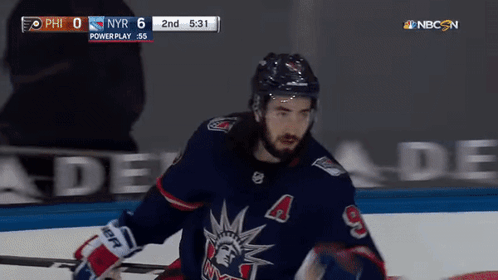 Mika Zibanejad celebrates a goal for the New York Rangers during a dominant 6-0 game.
