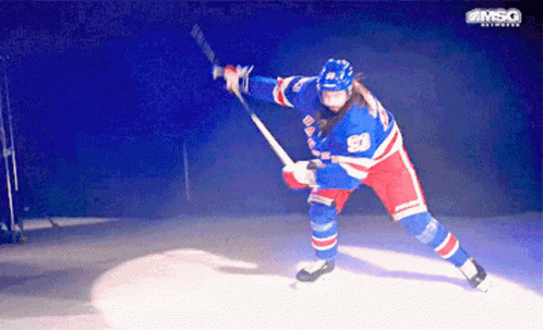 New York Rangers star Mika Zibanejad on the ice, preparing for a powerful hockey shot.