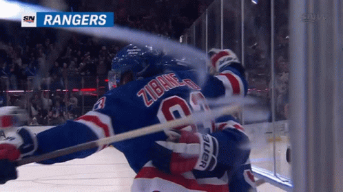New York Rangers player Mika Zibanejad celebrates a goal with teammates during an NHL game.