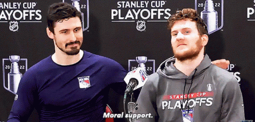 New York Rangers players Adam Fox and Chris Kreider provide moral support during a Stanley Cup Playoffs press conference.