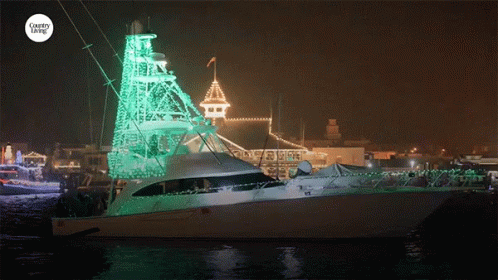 A festive yacht adorned with colorful Christmas lights sails through Newport Beach, California at night.