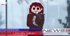 A pixelated cartoon character appears as a news anchor during a 'Storm Watch' report, with a humorous caption reading 'Literally satan'.
