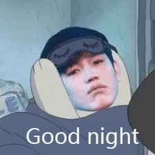 Thai actor Newwiee Taynew in a cartoon image, wearing a sleep mask and neck pillow, wishing 'Good night'.