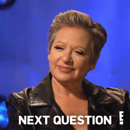 Caroline Manzo says 'Next Question!' while wearing a black leather jacket against a blue background.