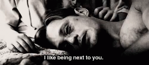 A tender moment from True Blood, with a man lying next to a woman and saying "I like being next to you."