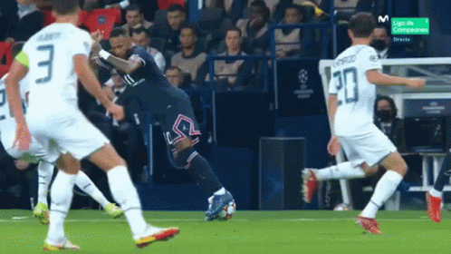Neymar attempts an acrobatic shot during a Champions League match, with Riyad Mahrez nearby.