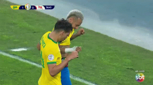 Neymar and Lucas Paquetá on the soccer field during a Copa América match, with Neymar showing a wrist bandage.