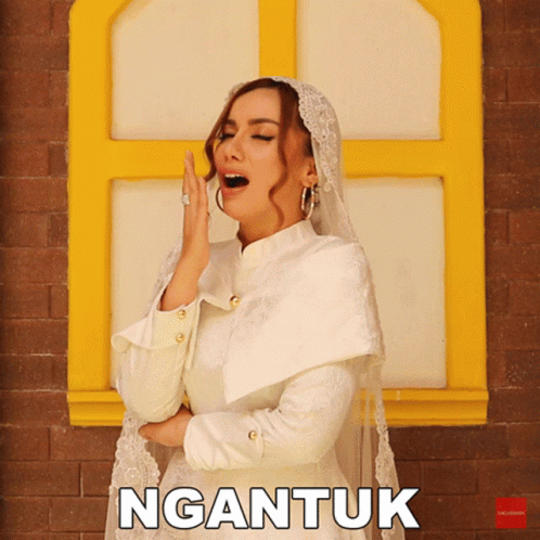 Balena yawning widely in a white wedding dress and veil, looking tired in front of a yellow window.