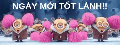 A group of Minions, including Stuart Minions, cheer with pink pom-poms under the Vietnamese greeting 'Ngày Mới Tốt Lành'.