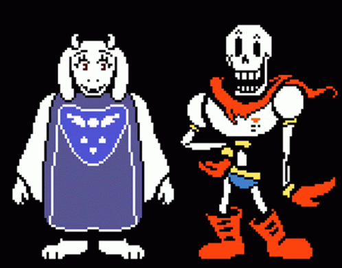 Undertale characters Toriel and Papyrus in pixel art, with Papyrus blushing and expressing excitement.
