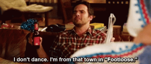 Nick Miller humorously explains why he doesn't dance, referencing the movie 'Footloose'.