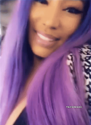 Nicki Minaj with vibrant purple hair, smiling and laughing in a close-up shot, with a Tayomaki watermark.