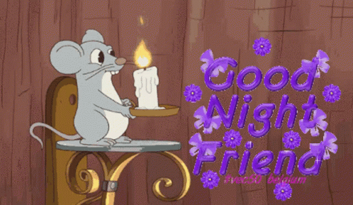 A charming cartoon mouse holds a lit candle, wishing 'Good Night Friend' with a touch of #vec50 belgium.
