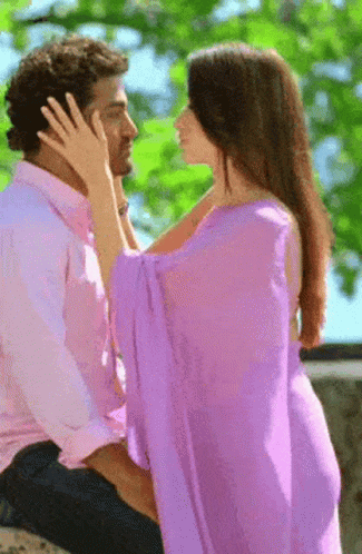 Niharika and NTR share a tender moment, with Niharika in a purple saree and NTR in a pink shirt, in a romantic scene.