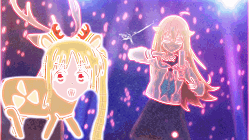 a drawing of a girl and a deer with antlers on a purple background