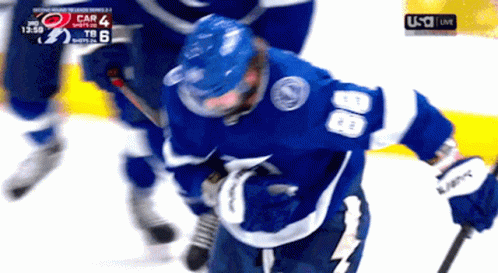 Nikita Kucherov of the Tampa Bay Lightning celebrates a goal during an NHL hockey game.