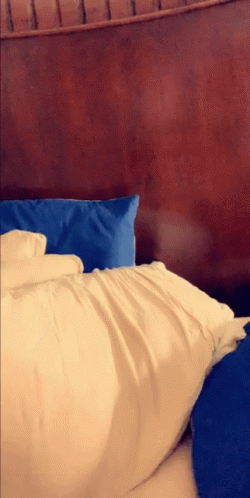 Nikki peeks from behind a bed with white and blue pillows and a wooden headboard.