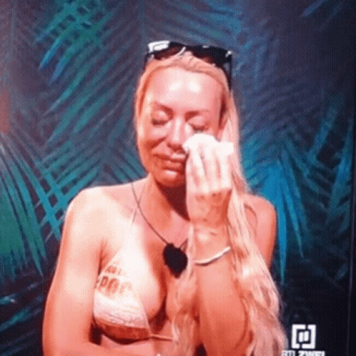 Nina Kristin, a reality star, is seen crying and wiping her eyes with a tissue while wearing a bikini.