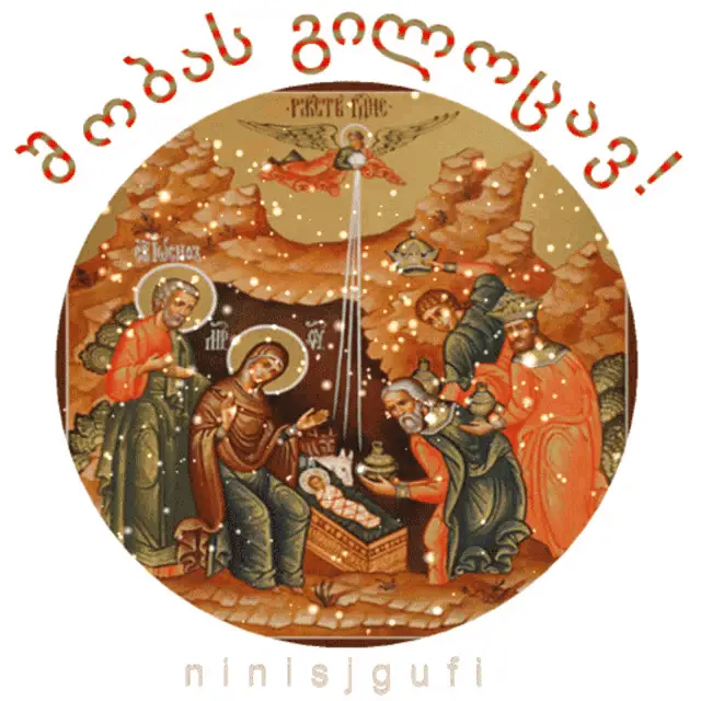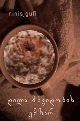 A close-up of Ninisjgufi coffee in a mug on a blanket, featuring Georgian text overlay.
