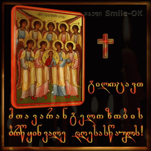 An Orthodox icon of angels and a cross, celebrating Archangel's Day in Georgia, with a festive greeting.