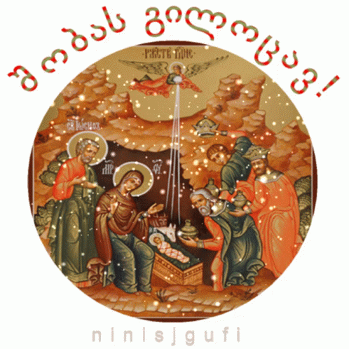 A festive Nativity scene with a Georgian Christmas greeting and sparkling effects, featuring the brand ninisjgufi.