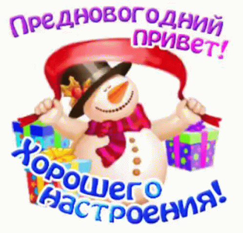 Ninisjgufi's animated snowman wishes a 'Pre-New Year's hello!' and 'Have a good mood!' with gifts.