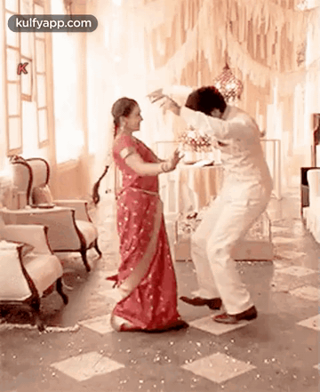 Nithya Menen and Dulquer Salmaan joyfully dancing in traditional Indian attire in a decorated room.