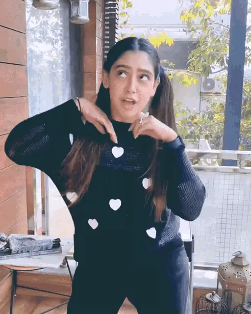 Niti Taylor joyfully dancing and twirling, wearing a black sweater adorned with white hearts. Her hair flows as she moves.
