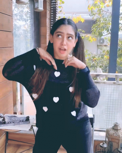 Niti Taylor playfully dances and flips her hair, wearing a black sweater with white hearts, on a balcony.