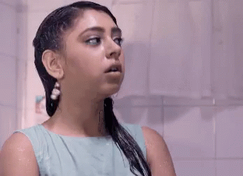 Niti Taylor as Nandini Murthy laughing playfully in a light blue dress, covering her face with her hands.