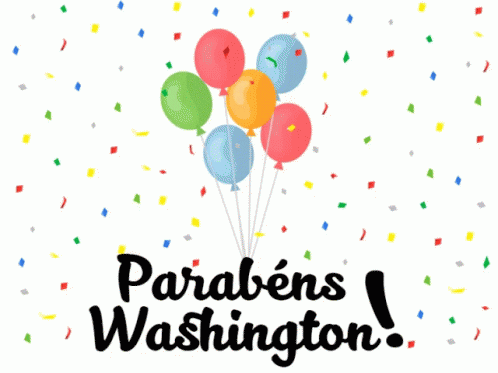 Animated birthday card for Washington with balloons, confetti, and Portuguese wishes for peace, joy, love, and happiness.